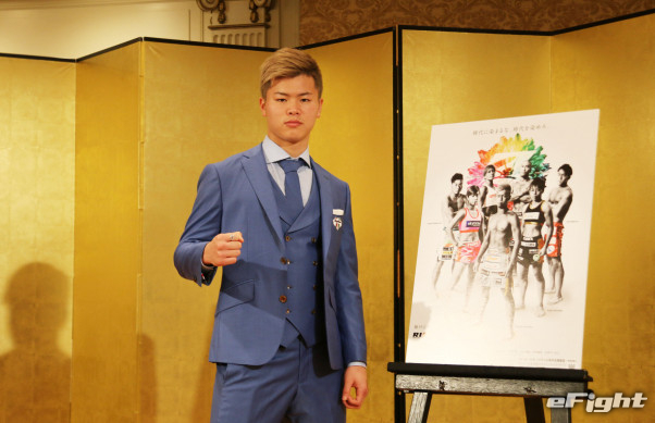 会見に出席し、神戸大会のポスターと共に写真に収まる那須川