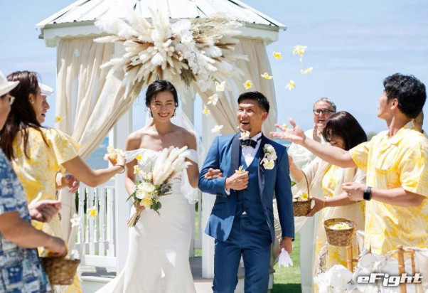 青い空と海の下挙式、右端は弟の功也 ©️ワタベウェディング