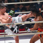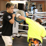 ドラムミットに左のオーバーハンドを打ち込む那須川