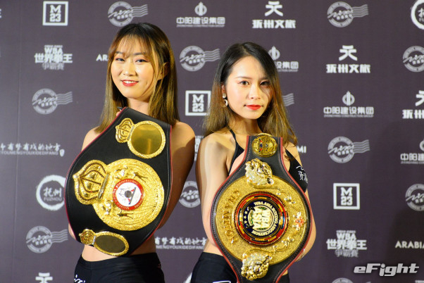 ベルトを持って華を添える中国のラウンドガール