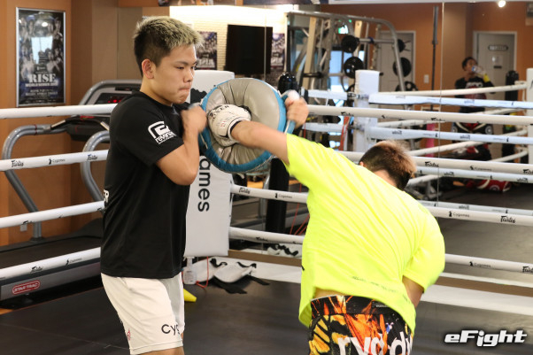 5月24日、那須川はミット練習で左のオーバーハンドパンチを打ち込む