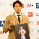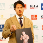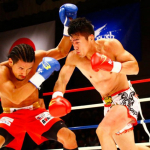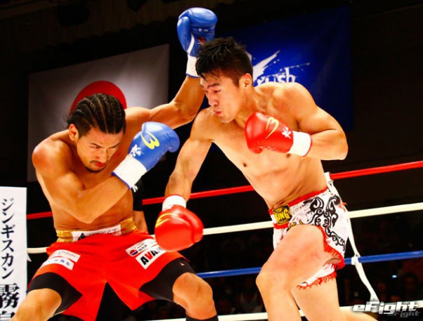 ジュンフェン(右)鋭い右ストレートでヒザが落ちた卜部兄(左)=2017年7月