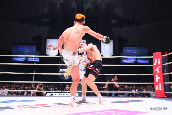 那須川の左ミドルがブランコのボディにクリーンヒット
