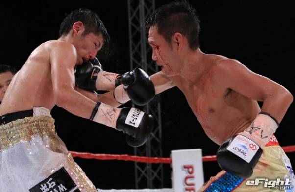 流血しながら打ち合いを展開する元世界王者の高山勝成(右)も五輪目指しアマチュアボクシングに挑む