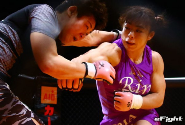 前回の試合で右ストレートを打ち込む中井りん。柔道出身の中井だが、打撃でのKO勝ちも7と多い。