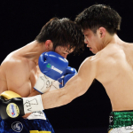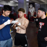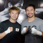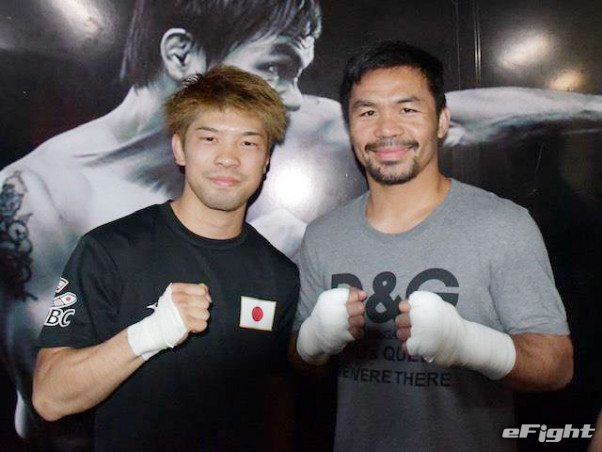 マニラの名門ジムで試合を控えたパッキャオ(右)と遭遇した田中