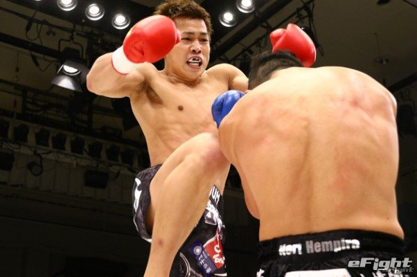 飛びヒザ蹴りで強襲する中島