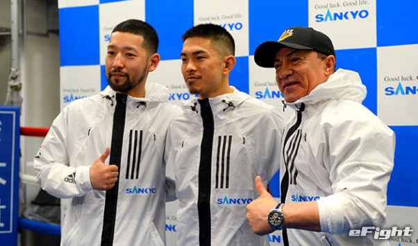 (左から)佐々木トレーナー、井岡、サラス・トレーナー