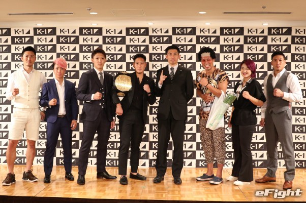 大阪大会に出場する選手が会見(左から山崎、KANA、野杁、林、中村プロデューサー、城戸、真優、平山)