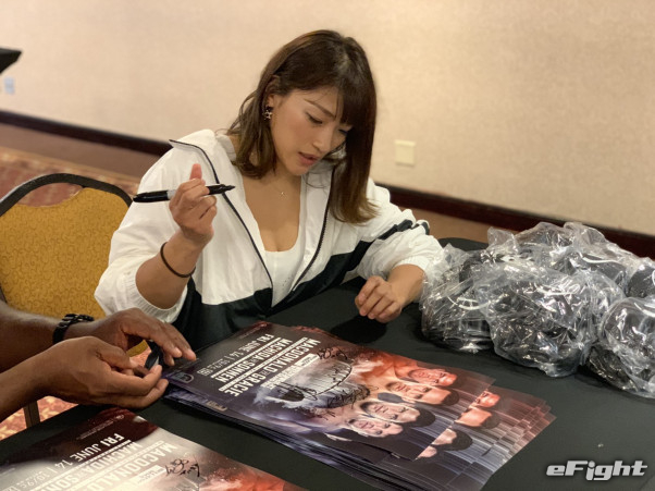 試合前、大会ポスターへサインするRENA