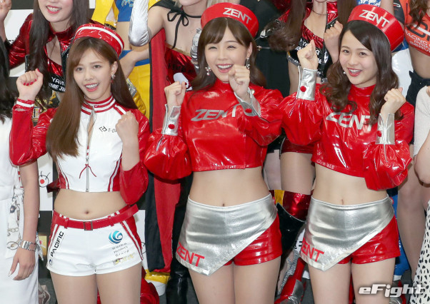 真ん中が川村那月。ZENTの赤いセクシー衣装でポーズをとる。