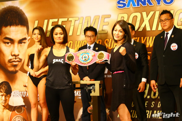 吉田(右)、モートンとも計量を一発クリア。両者とも世界初挑戦