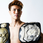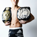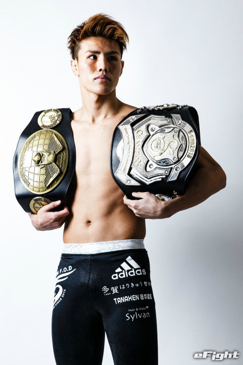 両腕にSB日本王者(左)と世界トーナメント(右)のベルトを背負う海人 (C)SHOOT BOXING