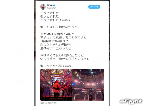 「悔しかったら強くなれ」と自身を鼓舞(RENAのツイッターより)