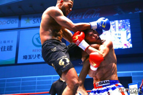 鮮やかな飛びヒザ蹴りで日菜太からダウンを奪うピケオー