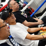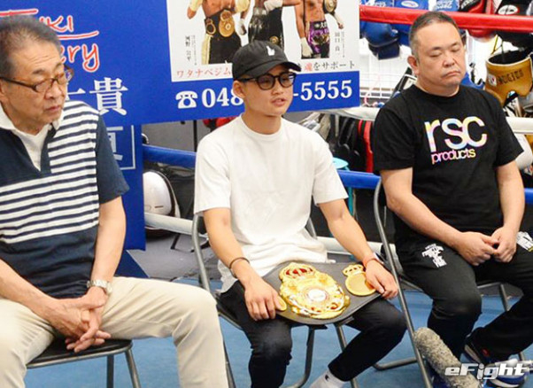 傷口を隠したサングラス姿で会見に臨んだ京口紘人(中央)