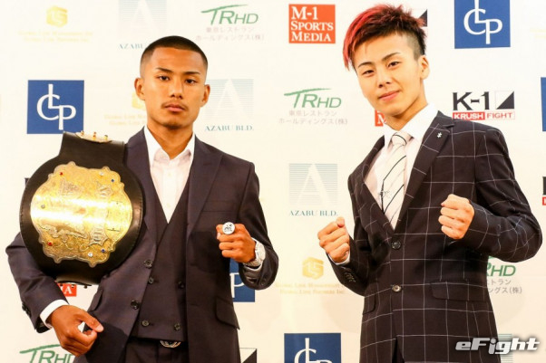 初防衛戦に臨む江川(左)とタイトル初挑戦のTETSU(右)