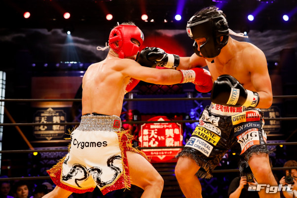 不利な状況ながら那須川(左)に右フックを打ち込む興毅