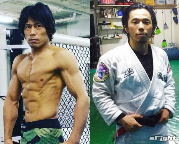 今でも衰えぬ肉体美を誇るタクミ(左)と、柔術では数々の実績を持つ吉岡(右)が激突