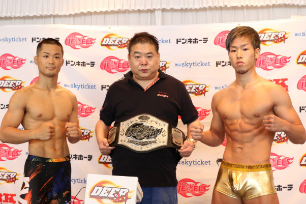 ベルトを持つDEEP佐伯代表を挟みポーズをとる柴田(左)と神龍(右)