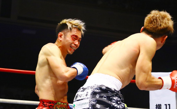 佐々木大蔵のバックハンドブローで負傷TKO負けを喫した不可思(左)