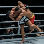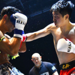 昨年6月にはソンヒョン(左)に判定負けを喫した松倉だが、力強いパンチをヒットさせる場面も