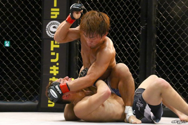 グラップリングの攻防から顔面に鉄槌を落とす猿田