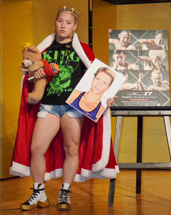 ふてぶてしい表情でポーズをとるKINGレイナ(顔写真は対戦相手エッガー)