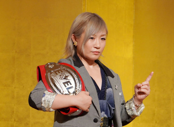 “日韓女王対決”に向け、ベルトを肩にかけて会見に登場した前澤