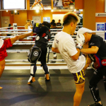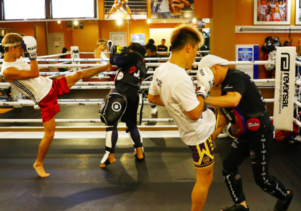 -61kg級の準決勝に進出した同門の白鳥大珠と共にミット打ちを披露