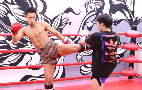 梅野(左)は志朗(右)とのマススパーではミドル・ローも交えたコンビネーションを披露