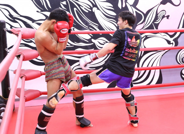 志朗(右)はガードを固める梅野へパンチからローのコンビネーションを見せた