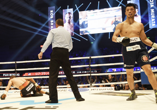 2R 中盤にダウンを奪った村田。そこから怒涛のラッシュでTKO勝利