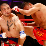 渡慶次のパンチがヒットし相手がマットに崩れ落ちる瞬間