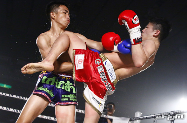 先月6月に階級を上げ挑んだ名高(右)圧力で来る相手にテンカオ(掴まない膝蹴り)を合わせる