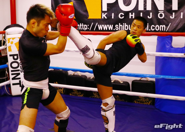前回の試合前の公開練習で。与座(右)とスパーリングを行った不可思(左)は「特に蹴り技が多彩」と高評価