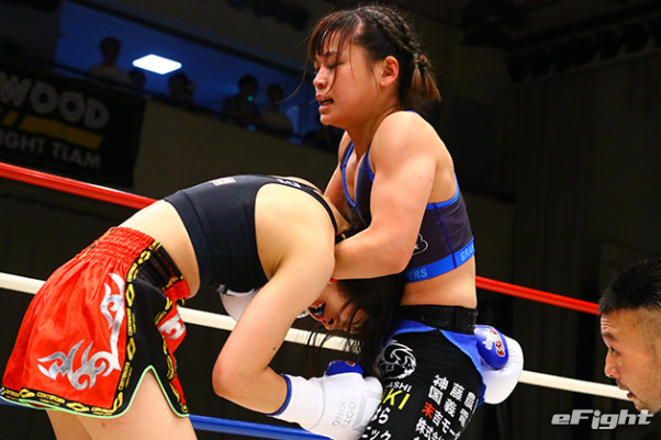 今年6月23日の後楽園大会ではフロントチョークでKO勝ちしたMISAKI(右)