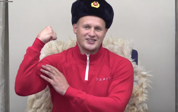 寿司を食べてエネルギー満タンと言い、力こぶを見せるシュメトフ (c)RIZIN FF