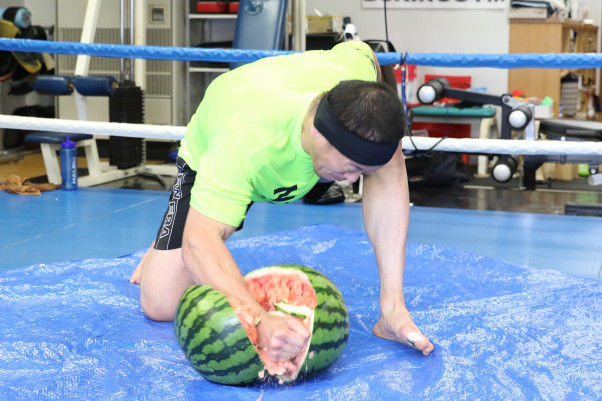 試合数日前の公開練習では好調ぶりを見せスイカを鉄鎚で割る余裕を見せた
