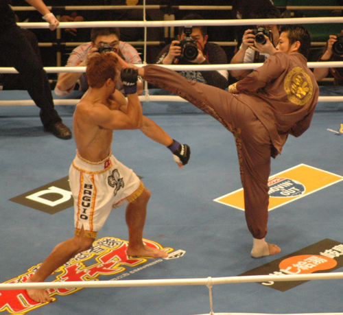 格闘家時代は奇抜な入場パフォーマンスも人気だった須藤(右)。カンフー衣で入場し、そのまま試合を行ったことも(06年3月・HERO’S)