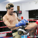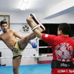 2mの身長から高く上げたミットに軽々とハイキックを蹴り込むカリミアン