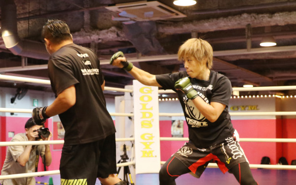 打撃スパーで仮想アムを相手に打撃で追い込む浜崎