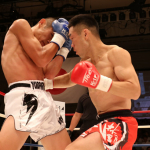 試合翌日、真剣な面持ちで一夜明け会見に出席したポンフェイ(前列右) (C)M-1 Sports Media