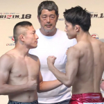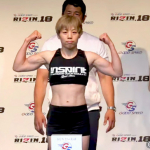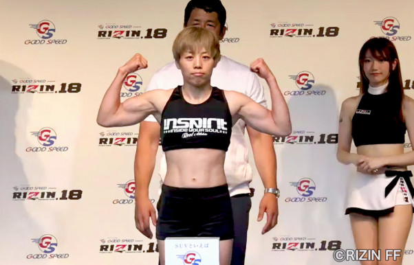 計量をパスしマッスルポーズの浜崎朱加。腕の力こぶの盛り上がりが凄い