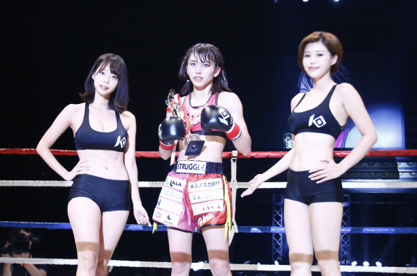 勝利し、ラウンドガールの青山ひかる(左)らと記念撮影するぱんちゃん