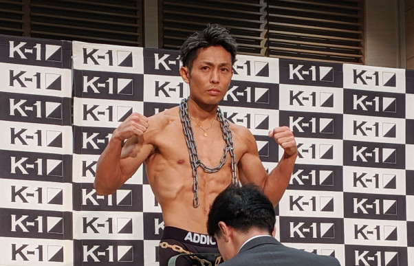 トレードマークの鎖を巻いたまま計量に臨む大岩