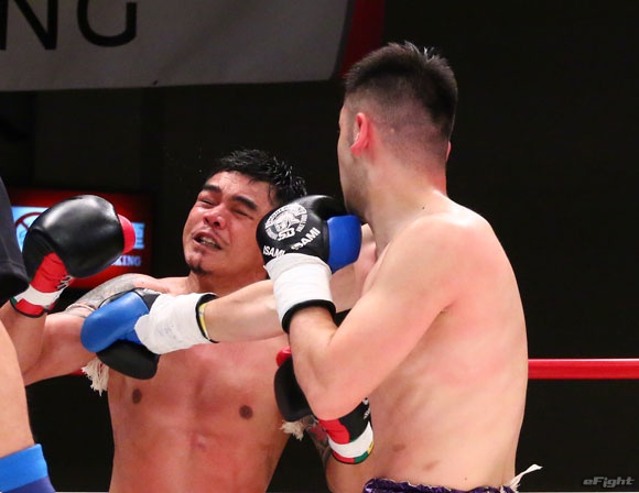 UMAのパンチがクリーンヒットし、ムエタイ世界王者のタップロンをKOした