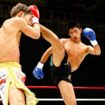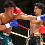 朝久空手をベースとする独特の間合いでKRUSHスーパーフェザー級トップ戦線に君臨する朝久(右)は2017年には大岩龍矢にも勝利