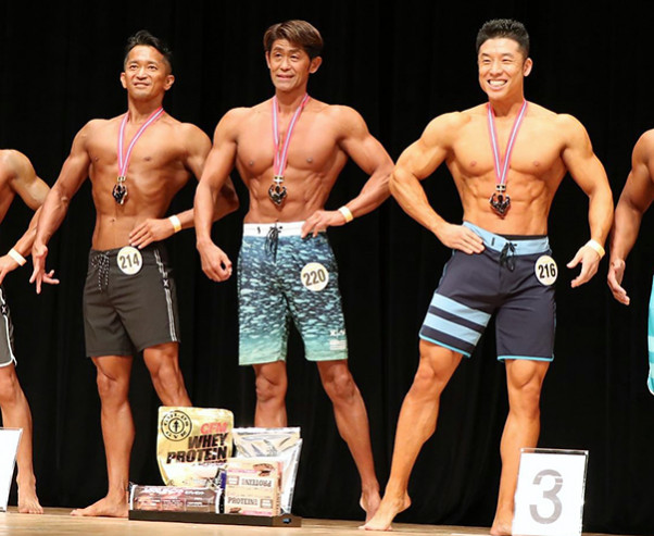 左から2位の公文誠、優勝の伊藤喜剛、3位のきんに君