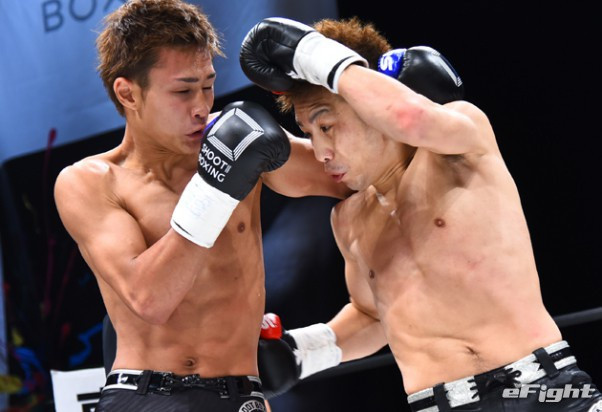 当時フェザー級王者の深田(右)を相手に激しく打ち合う笠原(左・17年11月)